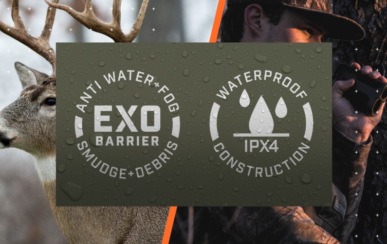 Dit glas is net zo robuust als jij. Met de Exo Barrier-lenscoating en IPX4-waterdichtheid biedt deze afstandsmeter een helder zicht, zelfs wanneer de natuur zich niet aan de regels houdt.